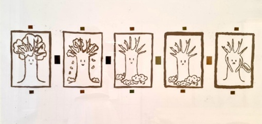 Die Rechtecke zeigen sich auch durch das zweite Bild. Hierbei wird ein Comic in 5 Panels über einen Baum der seine Blätter im Laufe dieser verliert gezeigt. Die Panels werden in ihrer Form noch einmal von kleinen Rechtecken umrahmt und spiegelt wiederum das andere Bild. Wobei diese Geschichte von kleinen Rechtecken unterstrichen wird. In der Lücke, punktuell drüber und drunter.