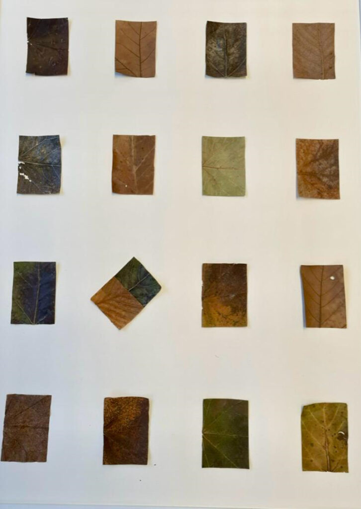 Außerdem wurde auch mit Laub gestaltet. Gesammelte Blätter werden zunächst eingeweicht, anschließend gepresst und getrocknet, danach werden diese zugeschnitten und in verschiedene Formen gebracht. Zur Befestigung des Laubs an der Rückwand werden natürliche Bindemittel, wie Kleber aus Kastanien oder Baumharz verwendet oder es wird mit Haaren vernäht.