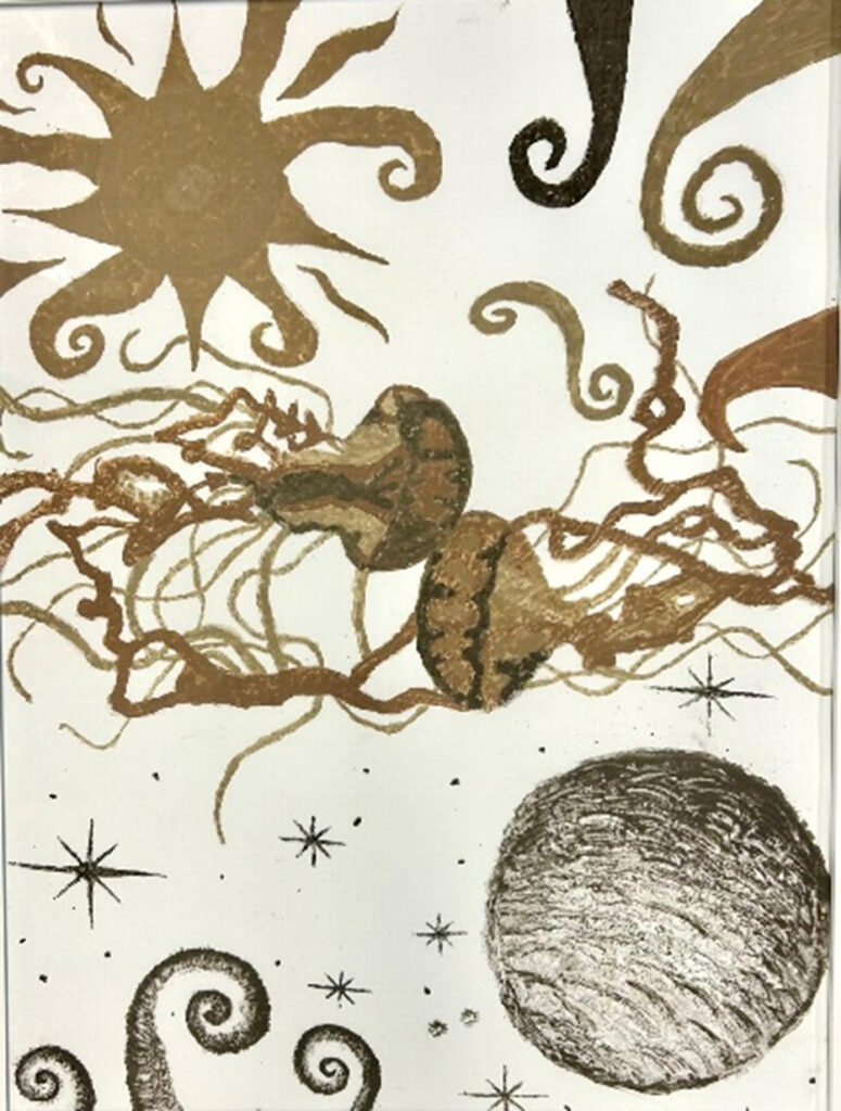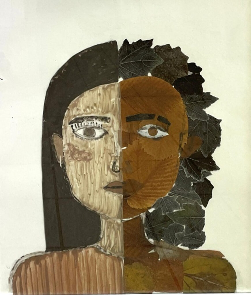 Wir haben ein Porträt gestaltet, bei dem wir Naturmaterialien kreativ eingesetzt haben. Eine Hälfte des Gesichts besteht aus echten Laubblättern, die die Lebendigkeit und Vielfalt der Natur darstellen, die andere Hälfte wurde mit Erde gemalt und symbolisiert die Verbindung zur Herkunft und zum Boden. Durch diese Kombination wollten wir den Gegensatz und zugleich die Einheit von Erde und Leben zeigen. Unser Werk trägt den Titel „Zwischen Erde und Leben“, da es genau diese Verbindung sichtbar macht.