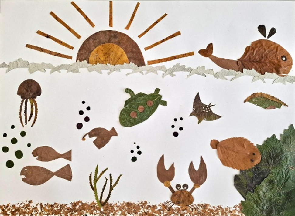 Unser Bild heißt Blättermeer, weil uns die Ideen für die verschiedenen Pflanzen und Tiere oft erst durch das Aussehen jedes Blattes kamen. So ist unsere kleine Unterwasserwelt immer mehr zum Leben erwacht. Beim Erstellen des Bildes hat es uns besonders Spaß gemacht zu fantasieren, wer dort sein Zuhause hat und wo.
