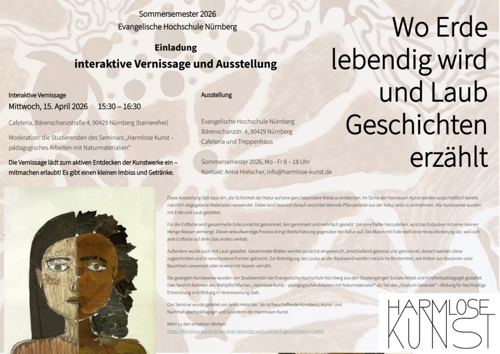 Die gezeigten Kunstwerke wurden von Studierenden der Evangelische Hochschule Nürnberg aus den Studiengängen Soziale Arbeit und Kindheitspädagogik gestaltet. Dies fand im Rahmen des Wahlpflichtfaches „Harmlose Kunst – pädagogisches Arbeiten mit Naturmaterialen“ als Teil des „Studium Generale“ – Bildung für Nachhaltige Entwicklung und Bildung in Verantwortung statt. Das Seminar wurde geleitet von Anna Hielscher. Sie ist freischaffende Künstlerin, Kunst- und Nachhaltigkeitspädagogin und Gründerin der Harmlosen Kunst.